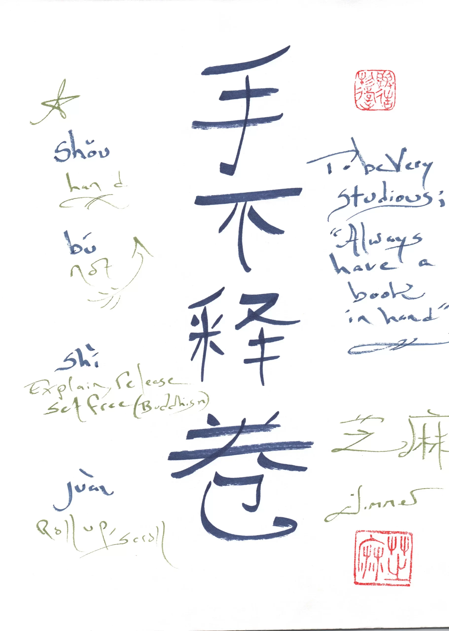 Shou Bu Shi Juan – Always with a book in hand – One who is studious.